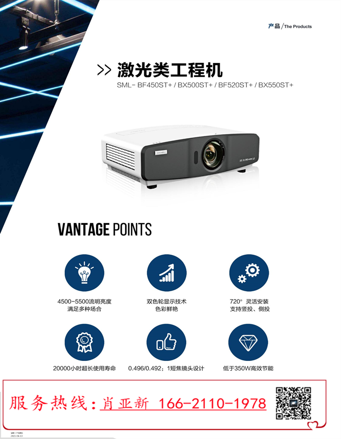 | [簡介]SML-BF550ST+/BX550ST+/BF550+一、技術參數:1.芯片尺寸(0.65英寸)對角線(16:9寬高比)2.顯示方式DLP™芯片x1,DLP™3.物理分辨率1080P,1920x10804.亮度55005.動態 |