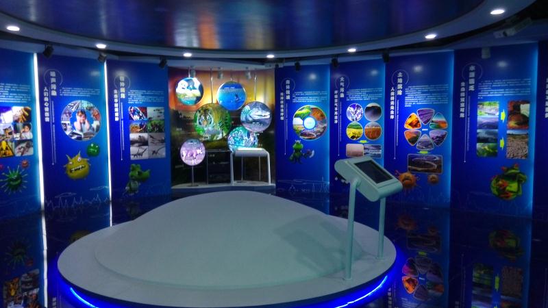 通過該展品,觀眾可從宇宙的視角來觀察自己所賴以生存的世界,了解地球的外界環(huán)境結(jié)構(gòu)及其來之不易的生態(tài)平衡;想象人類過分活動排放的過多溫室氣體對我們美麗的星球所引起的失衡后后果。 一具緩緩轉(zhuǎn)動的精美的虛擬地球儀,連綿不絕的云霧圍繞在它的周圍,襯托出我們?nèi)祟惿嫫胶獾氖澜�。采用單臺投影將畫面投射在球形內(nèi)表面,通過圖像處理系統(tǒng)幻化成連綿不絕的云霧所圍繞的地球,展示出我們?nèi)祟惿嫫胶獾氖澜纭?套 1