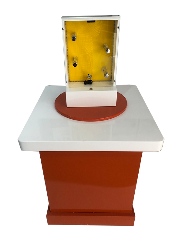 功能概述:展品由箱體、半透半反鏡、反射鏡、LED燈組、發(fā)光模型、擺動(dòng)機(jī)構(gòu)和操作手輪組成。前端是一面半透半反鏡,后端是反射鏡,燈光發(fā)出的光線被反射鏡反射回來(lái),一部分透過(guò)半透半反鏡而被看到,另一部分被半透半反鏡再次反射到后端反射鏡,多次反射后形成諸多物體的像,無(wú)限重復(fù)的影像,一個(gè)比一個(gè)更遠(yuǎn),就像一條無(wú)盡的隧道。當(dāng)擺動(dòng)后端反射鏡時(shí),光的反射路徑發(fā)生了變化,就會(huì)看到彎曲的光隧道。