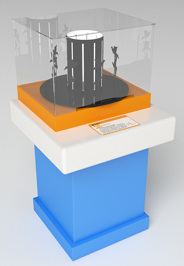 功能概述:展項由轉(zhuǎn)盤驅(qū)動機構(gòu)和心跳干涉圖案組合構(gòu)成,按下啟動按鈕,電機驅(qū)動光柵轉(zhuǎn)動,可看到莫爾條紋引起的視錯覺。