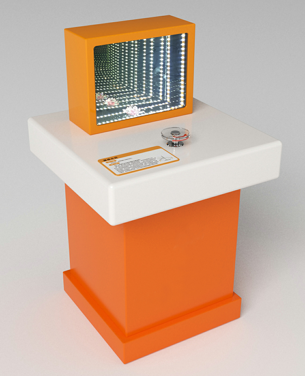 三、功能概述:展品由箱體、半透半反鏡、反射鏡、LED燈組、發(fā)光模型、擺動機構(gòu)和操作手輪組成。前端是一面半透半反鏡,后端是反射鏡,燈光發(fā)出的光線被反射鏡反射回來,一部分透過半透半反鏡而被看到,另一部分被半透半反鏡再次反射到后端反射鏡,多次反射后形成諸多物體的像,無限重復(fù)的影像,一個比一個更遠,就像一條無盡的隧道。當擺動后端反射鏡時,光的反射路徑發(fā)生了變化,就會看到彎曲的光隧道。