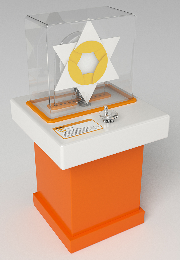 功能概述:展項由轉盤驅動機構和心跳干涉圖案組合構成,按下啟動按鈕,電機驅動光柵轉動,可看到莫爾條紋引起的視錯覺。