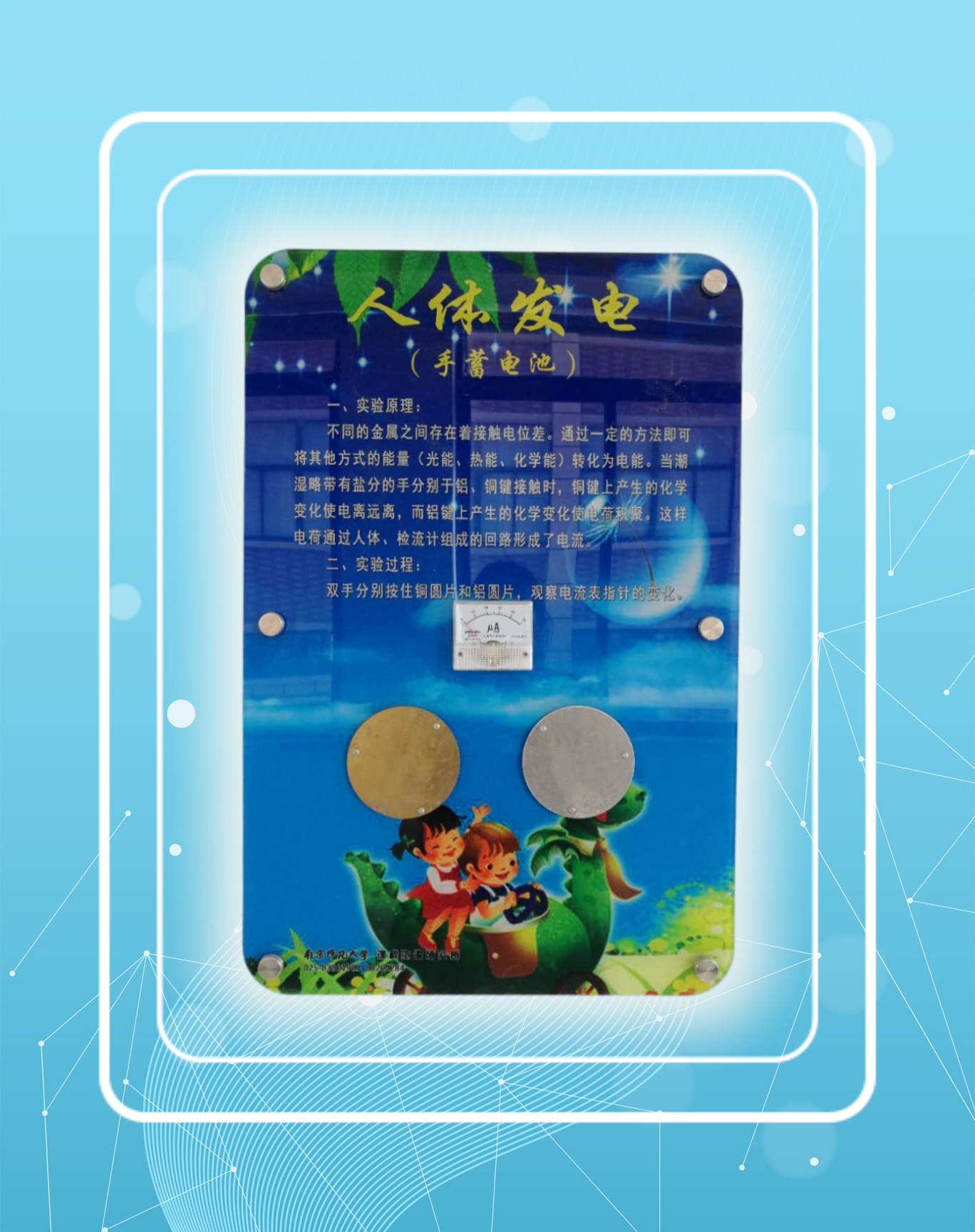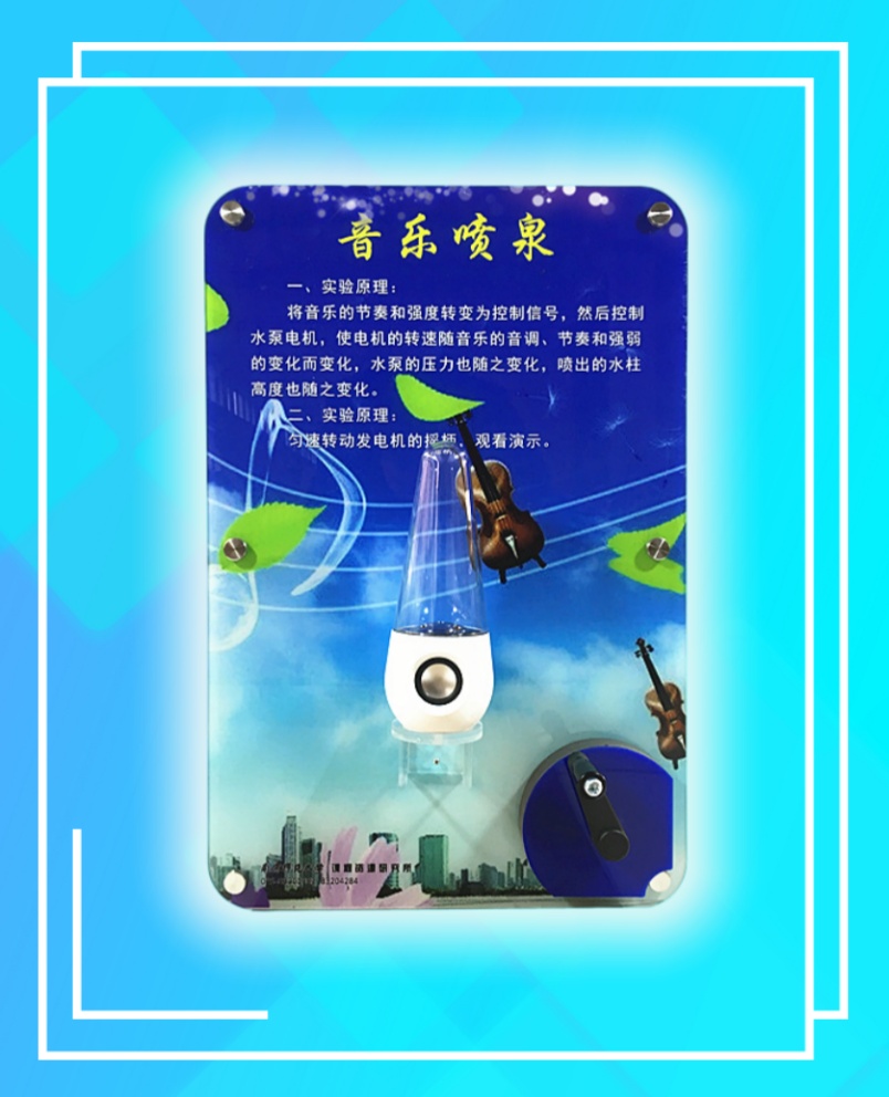 規格:400X600,主要展示器件安裝于亞克力前板上;前板為5mm厚亞克力板,畫面采用UV打印技術,背板采用12mm抗貝特板;前后板可用6顆36mm的工藝螺釘固定于墻體上。采用模塊化手搖發電機構和穩壓穩流技術供電。