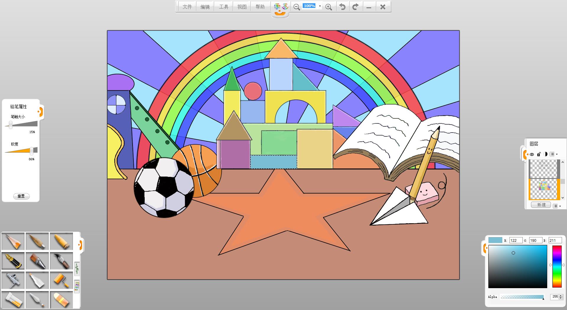 18.使用相同的方法繪制背景中的其他物件:積木城堡、書筆橡皮和星星地板。