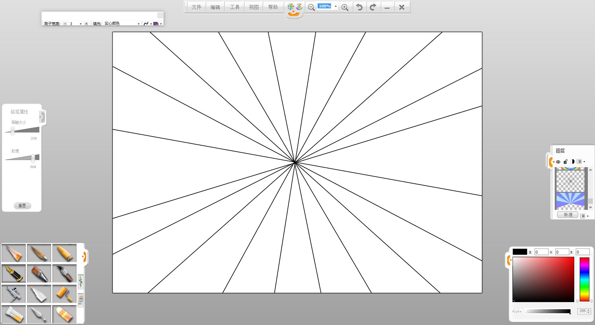 11.將人物圖層先隱藏備用。創建一個新圖層,使用工具菜單下的直線工具繪制十條相交的直線。