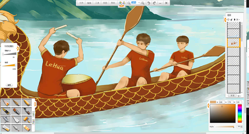 20.用馬克筆筆觸選取淡黃色(偏白),涂在龍舟和人物的受光面上,然后用刮刀筆觸涂抹均勻。