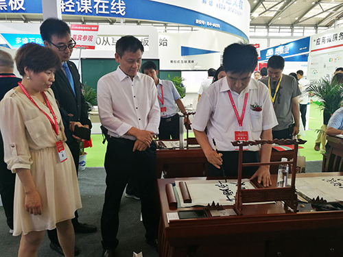 教育部關(guān)心下一代工作委員會常務(wù)副主任、中國教育裝備行業(yè)協(xié)會會長王富蒞臨展位,體驗(yàn)智慧書法教室并給出高度評價(jià)。