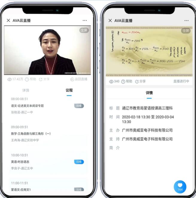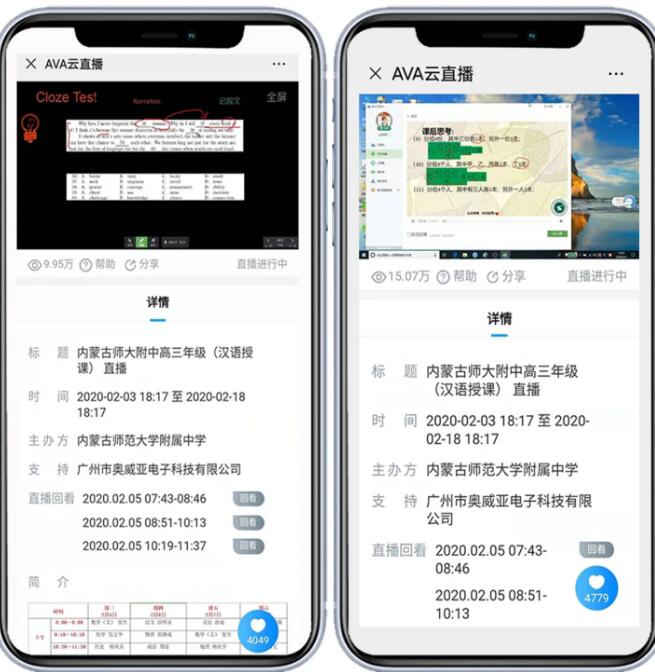 2月6日,阿拉善盟第一中學在奧威亞錄播教室和移動錄播設(shè)備支撐下,順利組織高三學子開展“空中課堂”,這也是內(nèi)蒙古自治區(qū)第一個實施疫情期間“停課不停教、不停學”的學校。通過奧威亞云直播技術(shù),學生只需在家通過手機、平板、電腦等便攜方式即可進行聽課,真正實現(xiàn)在“師生不聚集”前提下,開展教學活動。