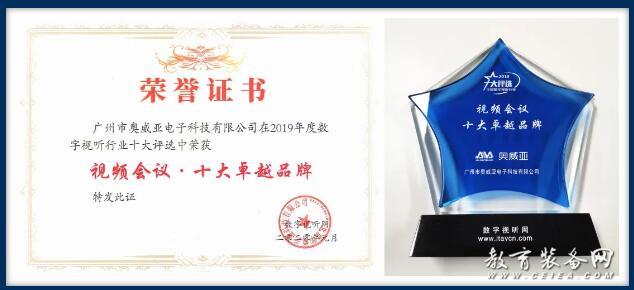 圖為奧威亞榮膺“2019視頻會(huì)議-十大卓越品牌”證書與獎(jiǎng)牌