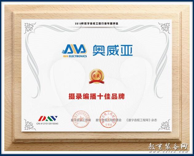 圖為奧威亞榮膺“攝錄編播十佳品牌”證書