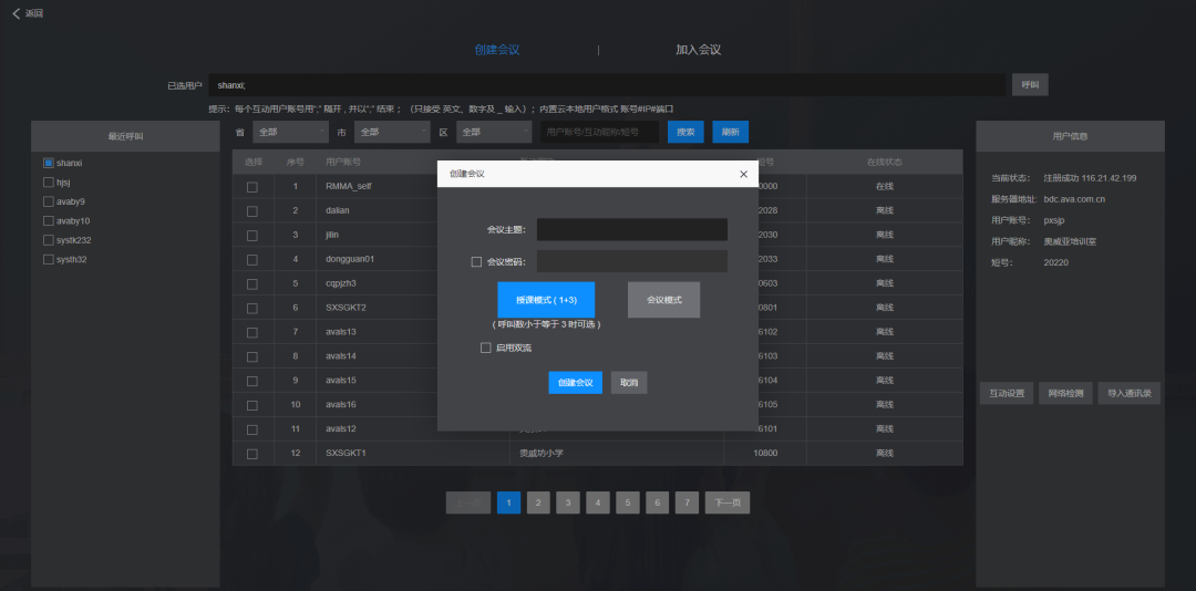 2.選擇互動(dòng)課室(自己用戶名無需勾選),按“呼叫”按鈕;
