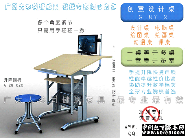 創(chuàng)意設(shè)計桌 多功能升降,一桌等于多桌: 普通書桌、繪畫,設(shè)計桌,一間課室等于多間課室。 ·作普通書桌:可微調(diào)高度角度,預(yù)防近視、腰椎病和頸椎病。 ·特殊書桌:可站立學(xué)習(xí)和工作,回復(fù)人體脊椎和呼吸的自然狀態(tài),預(yù)防肥胖和痔瘡。 ·作繪畫桌、設(shè)計桌:可調(diào)任意角度,可調(diào)節(jié)多個高度,可疊加大圖板;無需電源,價格低廉。 CREATIVITY TABLE Multifunctional movement,One desk has more functions: common desk, rawing table,designingtable. One classroom had three functions. ·As general desk :The height and the angle can be adjust,prevent from short sight , lumbar and neck hurt . ·As special desk :Can study and work at stand pose, and make your chine release, prevent illness . ·As design table :The angle and the height can be adjust ,and attach a big size board. No power needed ,low price.