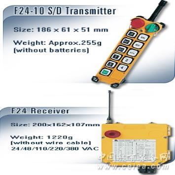 產品詳細介紹 * 10只按鍵(單速)+ 1只旋轉開機/備用開關鎖匙+1只蘑菇頭急停。                                       *操作溫度:-35~+80攝氏度*最大操作距離:100米*發射機電源:AA堿性電性×2*收發機電源:AC48/110/220/380V(可選擇)DC 12~24V *防護等級:IP65*識別碼:43位組不重復識別碼(32位元)*漢明碼:≥4*尼能加織的強化塑膠外殼,可防止摔落及強力碰撞所造成之損壞*IP65防水防塵等級。*全系列硬件/軟件完全相容,可節省庫存支出*低耗電(使用兩顆AA堿性電池平均使用壽命可達2個月)*可經由PC軟件設定多種按鍵功能(與Win98/ME/2000/XP相容),能完全滿足各種操作要求*接收機含輸出電纜線,安裝簡單、快速。*多重安全保護設計:漢明碼、看門狗線路、32位元不重復識別碼