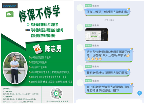作為合江縣少岷職業教育集團骨干教師陳志勇老師,在春節期間一刻也沒有放松過學習。在2月4日晚,陳老師對全校老師進行“如何玩轉希沃云課堂”專題培訓,深夜還在教師群里討論交流使用希沃云課堂。帶領學校各科優秀教師為全體學生提供在線教學、互動答疑,學生居家學習,既防控了疫情,又保證了學生的學習效果。