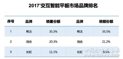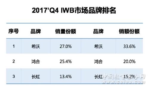 此外,在2017年第四季度,希沃再次以交互智能平板單項業績摘得IWB(交互顯示產品:包含投影白板和交互智能平板)整體行業市占率桂冠,銷量、銷額占比分別為27.0% 和33.6% ,是希沃繼2017年Q3第二次躍居IWB行業第一 。