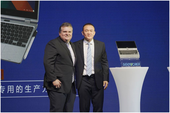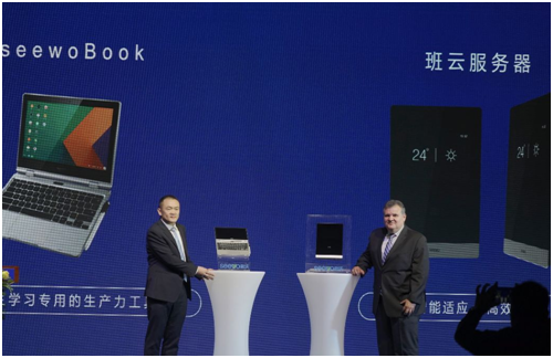 會上,希沃攜手英特爾正式發布智慧課堂兩大全新產品——seewoBook、班云服務器。視源股份未來教育集團總裁黃明寒與英特爾物聯網事業群零售事業部副總裁Jose avalos一同揭開新品面紗,共同見證這個神圣而偉大的時刻。