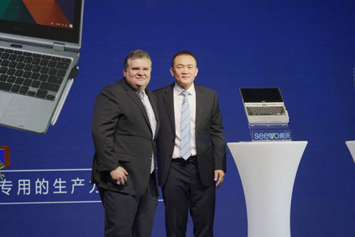 2.希沃聯合英特爾正式發布seewoBook、班云服務器。視源股份未來教育集團總裁黃明寒與英特爾物聯網事業群零售事業部副總裁Jose avalos一同揭開新品面紗,共同見證這個神圣而偉大的時刻!