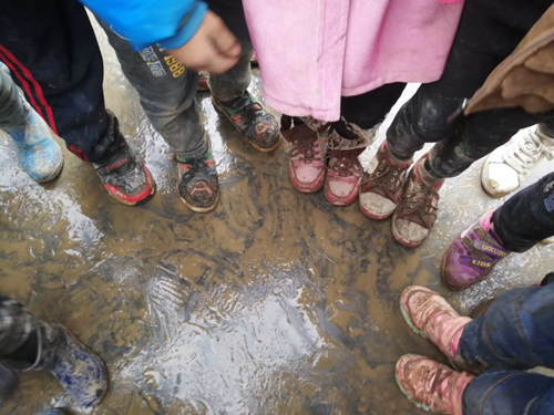 好多孩子穿的要么是笨重寬大不透氣的雨鞋,要么是滿是泥水、濕透了的帆布鞋或球鞋,這一濕就是一整天。有幾個男孩腳上穿著姐姐留下的粉紅鞋,卻很滿足地說很喜歡。問孩子們冷嗎?他們靦腆地笑著搖頭,卻告訴我們他很喜歡學校,這兒比家里吃得好,玩得開心。看著這樣一群質樸的孩子,心里一陣酸楚。