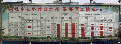 周末在果珠鄉中心校和老師們磨課,看見校園里的宣傳欄有這樣一張表格——“果珠鄉義務教育均衡發展基本情況”。回想起這幾天在鄉里看到的“控輟保學”標語,讓我第一次認真地去思考教育均衡這個命題。