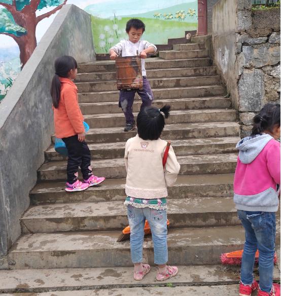 不一會兒孩子們上午的課程就結(jié)束了,因為孩子們離家比較遠,所以都會在學校吃午飯。那天剛好是一周一次的大掃除日,孩子們需要先清潔校園,然后才吃午飯。一個個比掃帚矮一大截的小朋友,沒人指揮、沒人監(jiān)督,都自覺認真地清掃校園,當天的溫度在10度左右,我穿著羽絨服幫忙掃樹葉都覺得冷冷的,可是有的小朋友就穿了一兩件單薄的衣服,流著鼻涕,小手凍的紅紅的,還在地上撿樹葉、掃樓梯、擦門窗。看著一個個忙碌的小身影,我很心痛,到底是怎樣一種生活環(huán)境,才讓他們有著這般和年紀不符的成熟懂事啊。