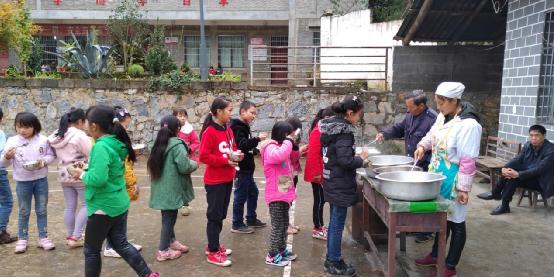午飯時間到,廚房的阿姨把飯菜端到操場上,小朋友們自覺的拿著餐具排起了長隊,大家捧著飯菜,在沒有桌椅的操場上,坐在樓梯邊的、蹲在地上的、倚在墻邊的,沒有吵鬧、沒有挑食、沒有浪費,老師和孩子們一起開心的吃著“豐盛”的午飯。