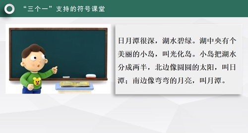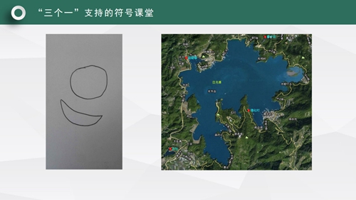 我們老師現(xiàn)在教學(xué)借助這樣的一張照片,我們老師可以帶著學(xué)生結(jié)合剛才的文本,在老師的引領(lǐng)下學(xué)生借助多媒體直觀的地圖照片,孩子就能理解日月潭為什么叫做日月潭。