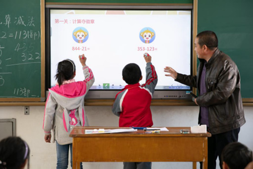 (公地鄉(xiāng)小學(xué),老師指導(dǎo)孩子在一體機(jī)互動)