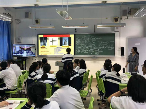 八十六中的“廣州市優秀教師”、“廣州市名班主任”鐘老師利用希沃交互智能錄播開展了一節遠程交互英語課,兩個教室的孩子們都聽得聚精會神。