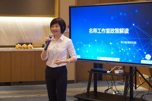 13日上午,希沃教育研究院的胡婷玉院長首先做了《名師工作室政策解讀》的專題報告。其從國家政策的角度去闡述組建名師工作室必要性及其發展方向,并提出了“示范、引領、指導、輻射”四大職能,提到名師工作室是區域教師信息化成長的有力推手。