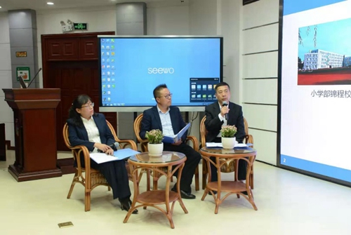 在汽開區進修學校趙越副校長的主持下,校長團隊展示了“聚焦整校推進尋求破解之道”主題論壇。第九中學李旦峰校長分享了立足于頂層設計,破解了2.0提升工程與學校整體規劃如何有機結合的問題;第七小學鐘梅校長、第十二小學王安巍校長分別從研修模式重構、研修方式重塑兩個維度談如何將2.0提升工程工程的實施與校本研修融合為一體的思考與策略;實驗學校周國兵校長、第一中學尤君志校長分享了基于學校教師隊伍年齡偏大,如何破解老教師參與到2.0提升工程與技術應用的問題。其中均提到希沃對于學校信息化建設。