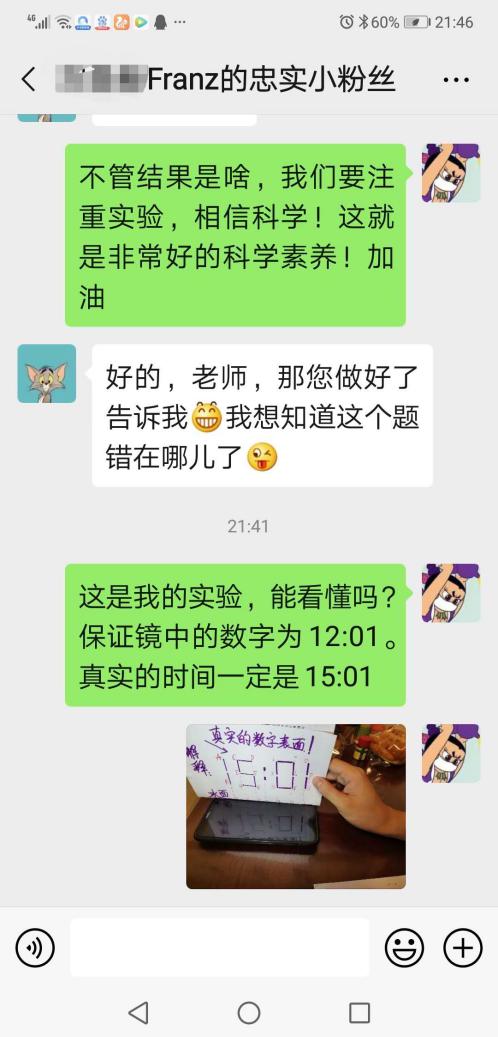 直播結束后,我通過微信對當天的問題釋疑解惑。例如上節課的第九題,那道題有難度,我選擇它就是要讓學生知道鏡子有兩種放法: