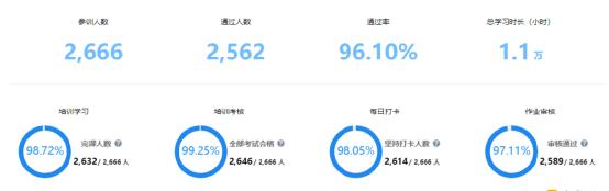 此次培訓(xùn)獲得河池宜州區(qū)教育局高度重視以及全區(qū)老師的積極響應(yīng),截至2020年6月1日,初階培訓(xùn)取得圓滿的成功,全區(qū)教師累計學(xué)習(xí)時長共計1.1萬小時,培訓(xùn)考核通過人數(shù)為2562人,考核成功率超96%,此次培訓(xùn)達(dá)到預(yù)定目標(biāo),基本實現(xiàn)老師能夠通過培訓(xùn)掌握交互式課件制作的要求。