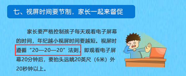 家長一起來督促”,要求孩子在觀看電子屏幕20分鐘后,家長督促其抬頭遠眺20英尺(6米)外20秒鐘以上。