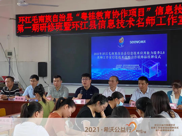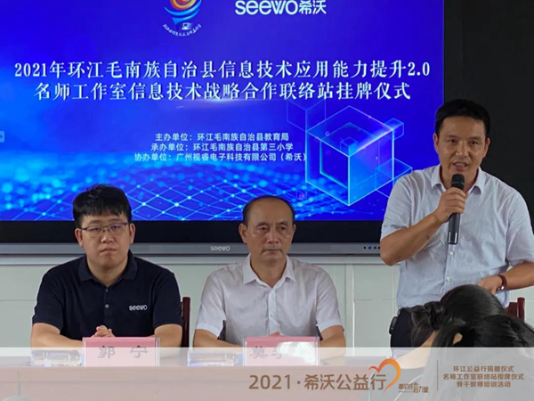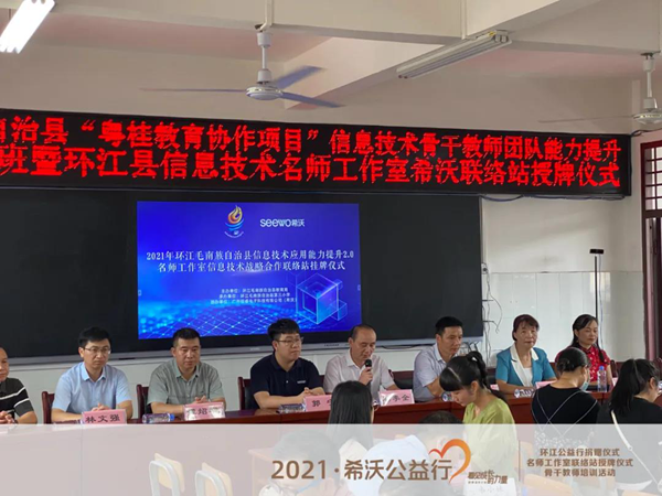 隨后,環江縣電教站站長黃廣正對本次活動的所有參與人員表示了誠摯的歡迎,并對接下來的活動發表了重要講話,并在發言結束后舉行了希沃公益行的捐贈儀式。