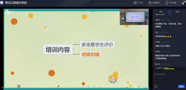 8月18日為培訓的第一階段,希沃講師趙自信老師通過希沃錄播直播功能,在線為老師們直播培訓,培訓內容圍繞《希沃白板基礎使用》、《班級管理》、《微課錄制實用技巧》以及《線上研修班開班儀式》四個不同版塊展開。