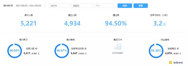 其中,對于培訓(xùn)的過程化管理,希沃使用了區(qū)域教師發(fā)展管理平臺來幫助區(qū)域管理者即時了解當(dāng)?shù)貐^(qū)域教師發(fā)展水平,這也為培訓(xùn)推進(jìn)決策的科學(xué)化提供數(shù)據(jù)支持。自培訓(xùn)開展以來,堯都區(qū)累計參訓(xùn)學(xué)校68所,參訓(xùn)教師人數(shù)5221人,培訓(xùn)結(jié)業(yè)人數(shù)4934人,綜合結(jié)業(yè)率高達(dá)94.50%,累計學(xué)習(xí)時長超過3.2萬小時。經(jīng)過本次線上培訓(xùn),區(qū)域內(nèi)教師信息素養(yǎng)得到了普遍提升。