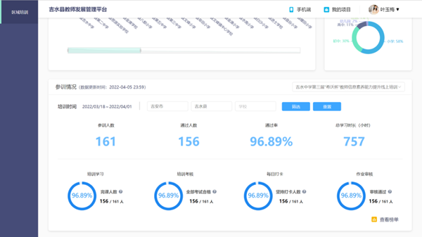 此次線上培訓活動為期14天,分設7節線上課程以及線上考核環節。報名開始后,吉水中學教師積極響應,踴躍參與,參與人數達到了161人,其中156位老師通過培訓,通過率達到96.89%。此次培訓旨在普及信息化技術工具應用,幫助教師掌握交互式課件制作的方法和美化技巧,掌握微課制作技巧并掌握信息時代的學生評價與管理方法。