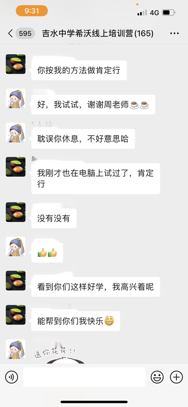 在正式培訓中,教師們興趣盎然地進行著學習,時常在學習群里互相交流、分享學習心得與軟件操作技術經驗。吉水中學與希沃講師團隊還共同組建了網絡教學微信服務群,并邀請經驗豐富的教學名師們在群里為參訓教師答疑解惑。當參訓教師們遇到實踐問題或疑難點時,大家都會積極提問、互相交流、耐心探討。在教師們來回討論之間,這場培訓活動的學習氛圍愈發濃厚。