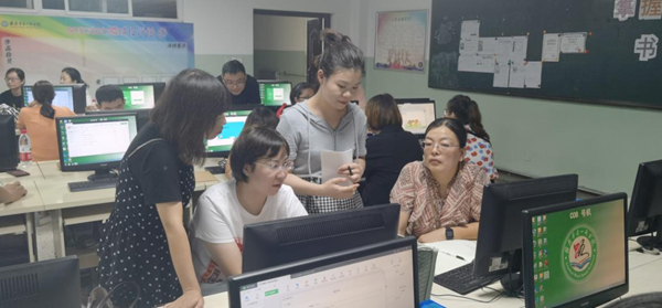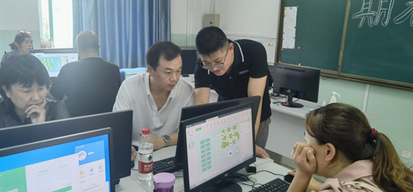 通過實操環節,老師們根據所學的內容在電腦上進行實操演練,通過小組研討制作學科融合課件,將同一主題融入到每一位老師的任教科目中,制作過程中,老師們不斷研討、修改、力求技術與學科的完美融合,針對不理解的內容,希沃講師也及時為老師們進行指導。
