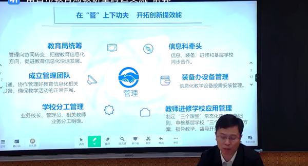 前郭縣王天昊主任從區(qū)域情況、方案設(shè)計(jì)、建管培用、取得成績(jī)四個(gè)方面介紹了前郭縣三個(gè)課堂的建設(shè)情況,指出“三個(gè)課堂”實(shí)現(xiàn)常態(tài)化應(yīng)用一方面需要城鄉(xiāng)一體化的硬件建設(shè),還需要在教師培訓(xùn)上多下功夫,同時(shí)要明確各部門職責(zé)分工并制定考核評(píng)價(jià)體系。