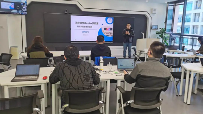 在清華大學的一間明亮且設計新穎的教室里,一名教師在大屏前操作,學生們分組坐在長桌子前拿著筆記本電腦操作……這是希沃與戴爾聯手構建的清華大學人工智能實驗室,這種以學生為中心的設計方式,更方便學生們開展小組研討與交流。