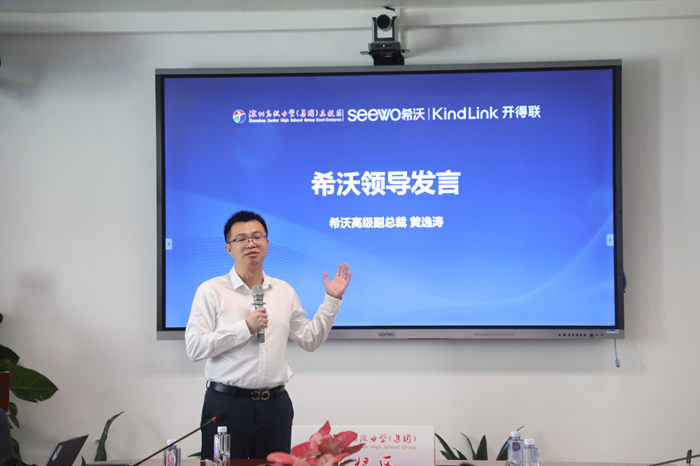 深圳市教育信息技術中心資源與應用發展部部長羅曉峰,深圳高級中學(集團)東校區小初部執行校長曹陽、科研處副主任吳恩康,希沃高級副總裁黃逸濤等相關負責人出席此次活動并發言。同時,活動邀請北京師范大學副教授張志禎,深圳市福田區教研員及一線教師結合希沃課堂智能反饋系統,以公開課形式實踐及研討智慧教育應用。