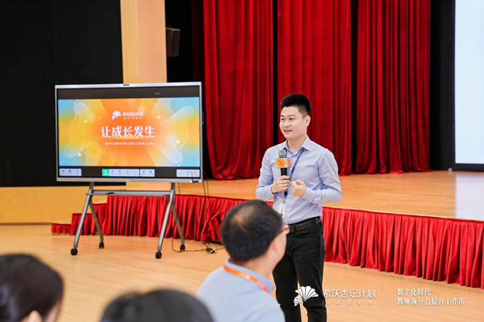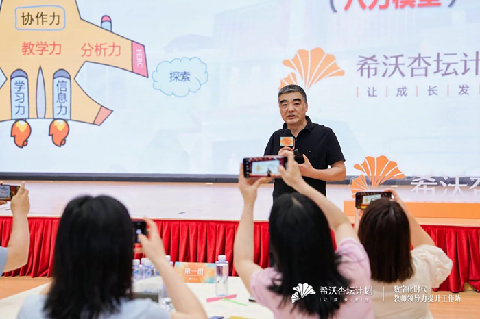 隨后,希沃杏壇計劃主理人梁杰向在場教師,詳細介紹了希沃杏壇計劃的設立起源及發展現狀,并進一步講解了與華南師范大學達成的產學研合作項目,及教師能力“杏壇導師八力模型”,其中,提及了學習力、信息力、設計力、分析力、教學力、協作力、指導力和領導力共八項專業能力。教師指導力、協作力,是引領教師團隊發展的重要維度。此次研修活動中將以教師領導力作為培訓目標,對教師指導力與協作力進行考察,助力教師回歸教師隊伍后,帶領更多教師成長,激發教師隊伍活力,切實發揮“以師育師”的作用。