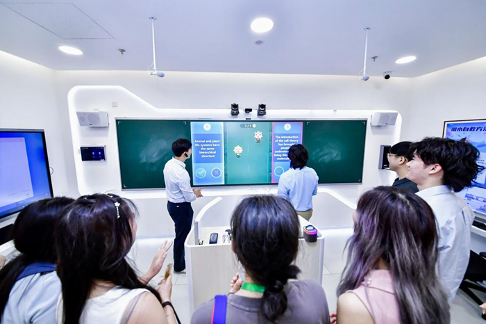 參觀現場,一場別開生面的生物知識競賽引起大家的關注和歡呼。來自美國的青年Mike和朋友沉浸式展開“知識賽跑PK”,重溫生物細胞的基礎理論知識。Mike表示:“太驚艷了,我現在所在的大學上課還是傳統的教學方式,使用的是傳統黑板,還沒有那么數字化的黑板。”