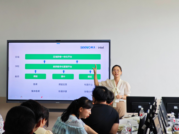期間,希沃山東區域服務運營顧問戴思作《希沃+AI、探索新技術在中小學教學教研中的實際應用》主題分享。她提到,當前,希沃課堂智能反饋系統提供的精準數據和客觀評判標準,能夠幫助老師們對比每節課的數據變化,去實現磨課閉環。教師發展中心湖南區域教師顧問程晨以“AI技術支持下的數字化共生教研新樣態”為題進行分享,為參訓教師開展循證教研提供新思路。