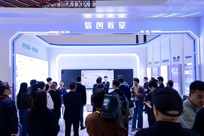 展會現場,視源股份希沃展區為觀展者打造了沉浸式的華騰智慧教室機房解決方案體驗空間。該方案以國產芯片與操作系統為核心,融合希沃智慧黑板及華騰分體式教學終端,構建起安全可靠、性能強勁的教學環境基礎平臺。