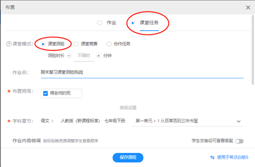 課堂一開始,如何讓學生快速進入狀態呢?不如來一次緊張刺激的課堂測驗限時挑戰,教師提前在希沃易課堂的教師空間-課堂任務準備好一份課堂測驗,課堂上推給學生立即作答。創建課堂測驗時需注意: