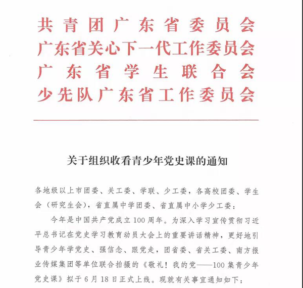 近日,共青團(tuán)廣東省委員會(huì)、廣東省關(guān)心下一代工作委員會(huì)、廣東省學(xué)生聯(lián)合會(huì)、少先隊(duì)廣東省工作委員會(huì)聯(lián)合發(fā)布《關(guān)于組織收看青少年黨史課的通知》,希望各地單位充分運(yùn)用《敬禮!我的黨——100集青少年黨史課》資源,通過自學(xué)、集中學(xué)等形式積極開展青少年交流實(shí)踐活動(dòng)。同時(shí),該通知的附件提供了清晰的青少年黨史課觀看指南,其建議有條件的學(xué)校可以組織學(xué)生通過希沃云屏線下觀看。