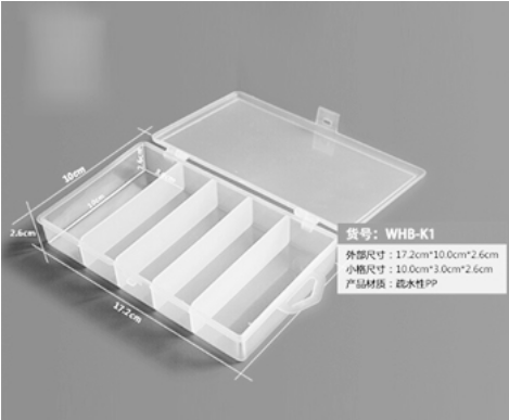 產品編號 格數 顏色 蓋子 小格尺寸 規格 WHB-K1 五格 透明 連蓋 長10cm寬3cm高2.6cm 1個/包,10個/盒 WHB-K2 單格 透明 連蓋 長8.4cm寬5.8cm高3.3cm 2個/包,20個/盒 WHB-K3 單格 透明 分蓋 長11.7cm寬6.5cm高3.4cm 2個/包,20個/盒 WHB-K4 四格 黑色 分蓋 長9.05cm寬3cm高36cm 1個/包,10個/盒