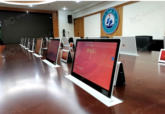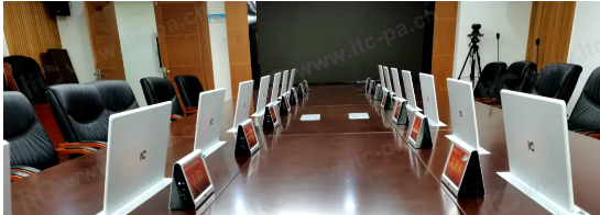 綜合教育局的實際情況,itc根據用戶需求及室內布局,在會議室每個座位設計一臺觸控無紙化智能桌面與終端主機相結合的無紙化會議系統,把會前、會中、會后的全部會議功能融入到系統當中,增加會議簽到、投票、信息交流、會議服務、人員管理、會議管理等應用功能,實現了整個會議的智能管控。